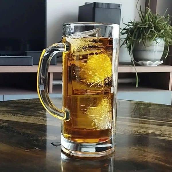Ấn tượng đầu tiên của mẫu ly thủy tinh uống bia này chính là dáng ly thẳng khỏe khoắn, kết hợp quai cầm dày chắc tạo cảm giác mạnh mẽ nhưng không kém phần tinh tế. Khi rót bia, màu vàng óng ánh của bia nổi bật qua lớp thủy tinh trong suốt, tạo cảm giác “mát lạnh tức thì” chỉ nhìn thôi đã thấy hấp dẫn. Các thông số thiết kế chuẩn cho phục vụ chuyên nghiệp: