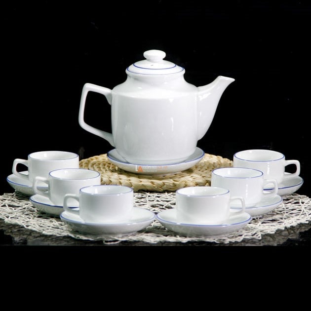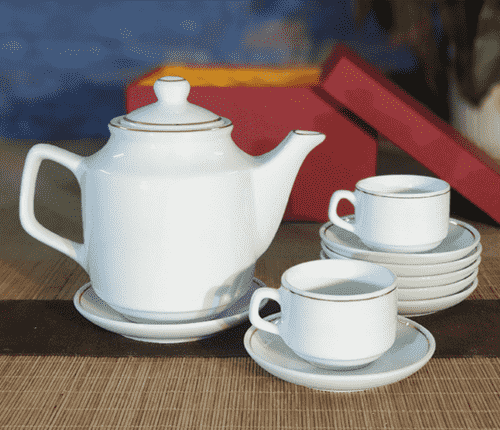 Bộ ấm trà sứ trắng dùng trong gia đình thể hiện sự trang trọng, dùng trong công ty thì thể hiện sự đẳng cấp.