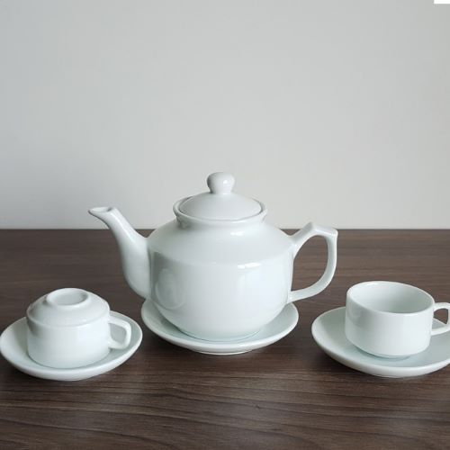Thông tin và quy cách sản phẩm Bộ ấm trà dáng Hongkong sứ trắng in logo