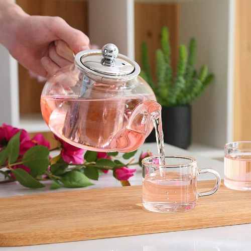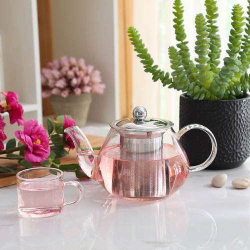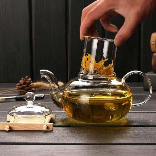 Thiết kế ấm trà thủy tinh tròn và có lõi lọc trà để lá trà không bị thoát ra ngoài, và rót nước vào tách sẽ dễ dàng hơn.