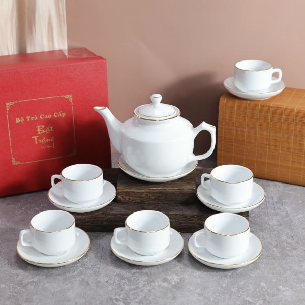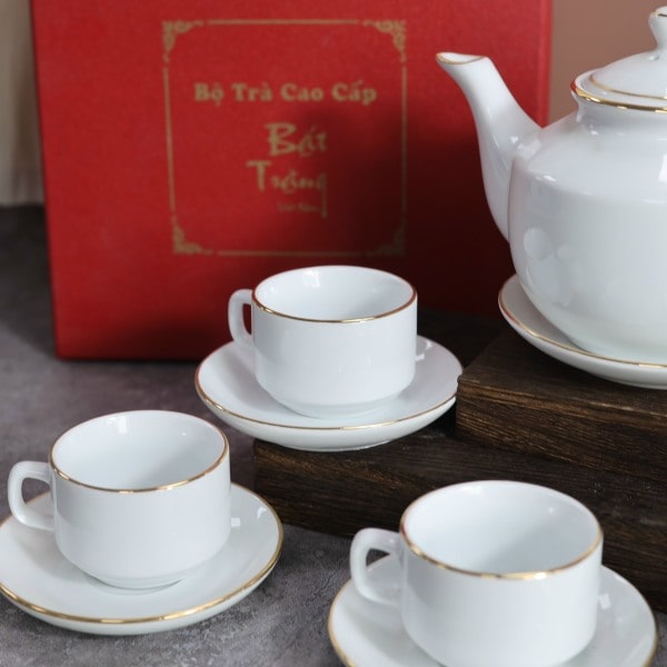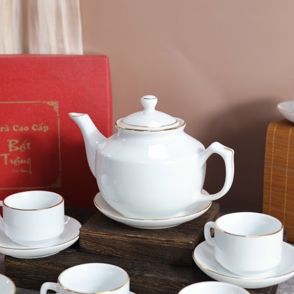 Cách sử dụng bộ ấm trà gốm sứ trắng viền chỉ vàng giá rẻ tphcm
