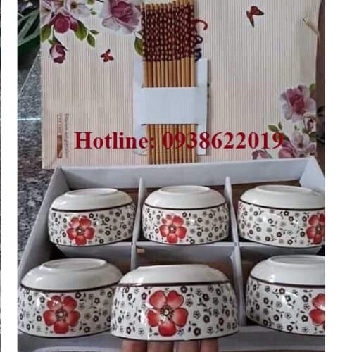 Chén sứ nhỏ kiểu hoa văn Nhật bản làm quà tặng nguyên bộ 6 chén sứ và đũa gỗ