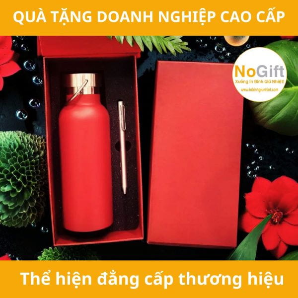 Bộ Quà tặng bình giữ nhiệt in logo quai xách inox 500ml kèm bút bi màu đỏ